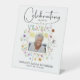 Modern memorial funeral pedestal sign features the wording 'Celebrating the Life of', your loved one's photo on a wildflower background, their name, and their birth/death dates. MATCHING items in our collection.