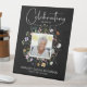 Modern memorial funeral pedestal sign features the wording 'Celebrating the Life of', your loved one's photo on a wildflower background, their name, and their birth/death dates on a black background. MATCHING items in our collection.