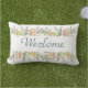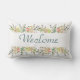 Welcome guests to your outdoor living space with this lumbar pillow. This pillow features a wildflower garden design on a white background. Personalize the text with your own words or buy as shown with "Welcome" in teal blue.