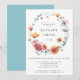 This design features a delicate watercolor wreath made of wildflowers in shades of blue, red, orange, violet, and gold. Perfect for outdoor graduation parties.