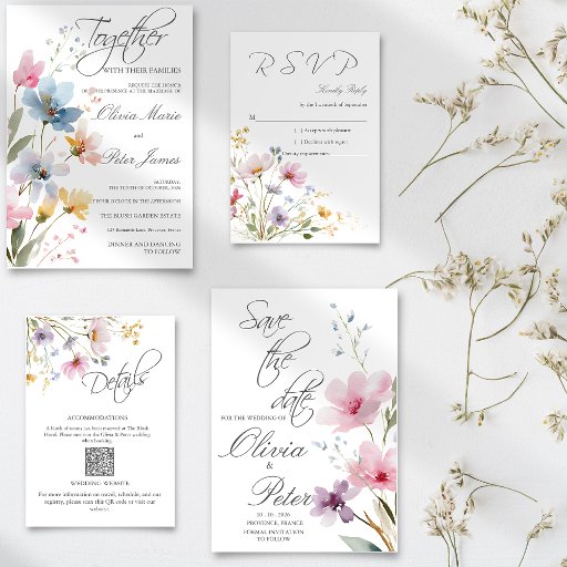 Share your essential wedding information with effortless elegance using our Whimsical Wildflower Meadow Details Card. Featuring a delicate, hand-painted watercolor floral arrangement cascading from the corner, this enclosure card perfectly balances minimalist design with romantic garden vibes.