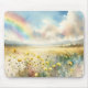 A serene landscape features a vibrant rainbow arcing over a field of wildflowers with mountains in the background
