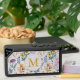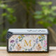 This bluetooth speaker features a watercolor wildflower pattern in soft purple, pink, warm yellow, and sage green, with a bold yellow monogram initial centered among the blooms. The white background keeps it feeling fresh and bright against the sleek dark gray body. It's a beautiful and practical personalized piece — perfect for birthdays, holidays, or anyone who loves pretty things that actually do something.