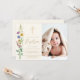 This floral Baptism photo invitation features wildflowers and a cross with stylish gold script typography on a soft cream background.