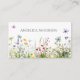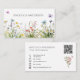 Feminine and clean white Watercolor wildflower meadow Business Card. The front has the design of a wildflowers meadow and butterflies with the cardowners name. The backside has all the essentials of a business card; name, title/company name, address, work phone, e-mail, mobile and web address. The companys QR code is up in the right corner for easy access to your web address followed by a sweet design of a small wildflowers bouquet and a dragonfly.