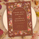 Elegant Wildflower arch terracotta burnt orange and gold foil fall wedding invitation. This enchanting boho wedding invitation is a stunning blend of autumnal warmth and elegant charm. Featuring hand-painted, watercolor wildflowers in a delightful wreath design, the invitation showcases a rich color palette of burnt orange, terracotta, brown, yellow, green, peach, coral, purple, and pink. The warm earthy tones combined with the rich terracotta burnt orange background create a perfect harmony, making it an ideal choice for a fall wedding. The elegant gold foil accents bring a touch of sophistication, while the elegant script in gold foil adds a personal, classic flair to all your essential wedding details. Designed by the talented artist Catherine Sweetman, this unique invitation embodies the spirit of a cozy, intimate celebration in the heart of autumn. With easy-to-personalize templates, it offers a seamless way to convey your wedding information with style and artistry. The background in a terracotta burnt orange. adding a natural warmth, bringing the beautiful florals to life in a way that feels both fresh and timeless.
