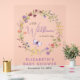 An elegant clear acrylic welcome sign for your baby girl shower featuring "a little wildflower is on her way" written in a mix of modern typography and a stylish lavender script, a boho-inspired watercolor wreath of purple, pink, peach and yellow wildflowers, and a purple butterfly. Personalize the mother's name and shower date.
