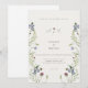 This sophisticated wedding invitation features watercolor wildflowers and botanticals arranged in an organic frame. A traditional floral invitation with a modern, boho twist. Muted blues, purples, pinks and greens give a gentle and elegant palette, while stylised monograms represent the future newlyweds.