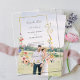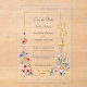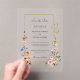 Graceful gold border on clear acrylic with elegant scrolls embellished with romantic boho chic watercolor pastel wildflowers in pale blue, pink and yellow. This charming collection is the perfect complement to your Spring, Summer or garden-themed wedding.
