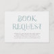 This baby shower book request card features a soft blue whimsical typography and is the perfect way to let your guests know to bring a book. The back of the invitation is a soft blue with wildflowers and branches.