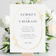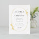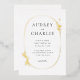 An elegant wedding invitation design features black typography on a crisp white background, surrounded by a delicate oval shaped wildflower wreath. The wreath is crafted from a variety of dainty wildflowers in gold foil, creating a soft and romantic look. The typography is elegant and sophisticated, with a classic serif font that adds to the overall charm of the invitation. The combination of the bold black text and the delicate wildflower wreath creates a stunning visual contrast, making this invitation a beautiful choice for a formal wedding celebration. The clean white background allows the other design elements to stand out and makes the invitation easy to read, ensuring that your guests will have no trouble finding all of the important details about your big day.