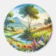 A vibrant springtime valley bursts with color in this scenic watercolor landscape, where blooming wildflowers dance along a winding stream beneath tall trees and soft golden light. Rolling hills and distant mountains fade gently into the background, evoking the quiet joy of countryside mornings. Delicate floral hues and painterly textures bring a sense of harmony, warmth, and rustic charm, perfect for adding natural serenity to any space. AI generated artwork.