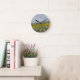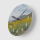 This wall clock features a landscape photo of yellow wildflowers blooming in the Arizona desert. The carpet of flowers is seen in the foreground with a lone saguaro cactus and a mountain in the distance.