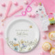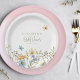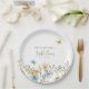 Delicate wildflowers meadow bouquet and butterflies with pastel watercolor floral blooms elegant chic spring or summer garden love in bloom bridal shower personalized paper plates with whimsical elegant modern calligraphy script over a white background.