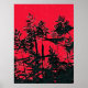 An abstract art design of black wildflowers silhouetted against a red sky.