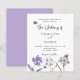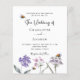 A white background. Decorated with bees and painted wildflowers in violet and pink. Personalize and add your names and the details.