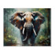 A majestic elephant stands front and center with its ears spread wide and its trunk hanging down towards water. The background features an impressionistic style with soft focus on trees, giving a sense of a misty, natural environment.