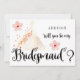 Will You Be My Bridesmaid cards with silhouette of bride in wedding dress, beautiful pink flower and custom black text, where you can add your and Bridesmaids name