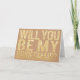 Folded greeting card with trendy, contemporary, stylish gold glitter block typography asking 'Will you be my bridesmaid"'. rustic card kraft stock background. Simple, minimalist, very sophisticated.