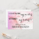 This 5" x 7" beautiful Will you be my bridesmaid? invitation card. This is best for the bride. If you looking at asking someone to be yourbridesmaid for your future wedding, then why not choose this bridesmaid cards. This customized invitation card will make your friend, sister cousin, nephew, daughter or whoever else you choose feel that extra special. This invitation is easily personalized by clicking on the customize it button under the image where you will be able to change the text, font and size. You can invite your best buddies in style with these classy invitations. It is suitable for the flower girl,maid of honor or for matron of honor. Send them this bridesmaid card.