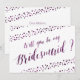 Will You Be My Bridesmaid cards with purple glitter (faux, printed as an image) and confetti and custom purple text, where you can add your and Bridesmaids name, printed on white background
