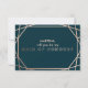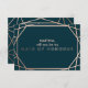 A modern and contemporary "will you be my maid of honor" card, features a "faux foil" gold rose geometric pattern over a dark turquoise background. All your details are spelled in a beautiful modern typo.