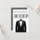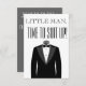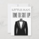 Little Man Time to Suit up with tuxedo on front. Personalized with ring bearer's name, message, groom's name, and a date given or the wedding date.