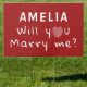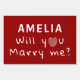 Will you marry me Heart Red Romantic Proposal Garden Sign. Will you marry me in modern white script typography with a white heart on a red background. Add your name.