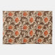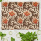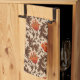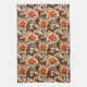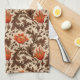 Kitchen towel in a vintage William Morris floral damask pattern of anemone flowers and leaves, digitally enhanced and colored - deep chocolate brown leaves, and flowers in shades of rust orange and soft gold, on a medium beige background