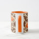 Coffee mug in a vintage William Morris floral damask pattern of anemone flowers and leaves, digitally enhanced and colored - deep chocolate brown leaves, and flowers in shades of rust orange and soft gold, on a medium beige background
