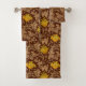 Towel set in a vintage William Morris floral damask pattern of anemone flowers and leaves, digitally enhanced and colored - light cocoa brown leaves, and flowers in shades of deep mustard gold / yellow on a dark chocolate brown background