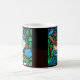 Mug in a William Morris Art Nouveau tile pattern, digitally enhanced and colored, depicting a bird in soft beige and brown, with vivid, cerulean blue flowers, green leaves, and wild strawberries, against a black background