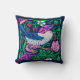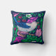 Throw pillow in a William Morris Art Nouveau tile pattern, digitally enhanced and colored, depicting a bird in soft gray and cobalt blue, with fuchsia pink flowers, green leaves, and wild strawberries, against a dark indigo / navy blue background