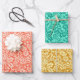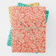 Wrapping paper in a vintage William Morris floral damask pattern, digitally enhanced and colored, in coral and peach, turquoise and aqua, and mustard gold and light yellow