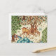 Postcard in a William Morris tapestry design of three deer beside a brook in a fantasy forest setting of trees in shades of soft green and aqua, against a beige background