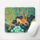 Mouse pad in a William Morris tapestry design of three deer beside a brook in a fantasy forest setting of trees in shades of soft green and aqua, against a dark indigo blue background
