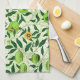 Hand towel in a William Morris Art Nouveau pattern of limes, pomegranates, and peaches, with blossoms, on leafy branches - fruit in lime green and coral orange, with green leaves, against a patterned, lime green and white background