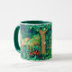 Mug in a William Morris tapestry design of deer in a fantasy forest setting - tan speckled deer in a lush, deep blue and green background of leaves and flowers, accented with red tulips