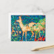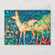 Postcard in a William Morris tapestry design of deer in a fantasy forest setting - tan speckled deer in a lush, deep blue and green background of leaves and flowers, accented with red tulips