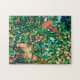 Puzzle in a William Morris tapestry design of a fox and a pheasant in flight in a fantasy forest setting of leafy green foliage and fruit trees