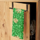 Kitchen towel in a William Morris Art Nouveau pattern of honeysuckle flowers against a background of vines and leaves - flowers in peach / apricot and cream, with emerald green leaves, against a pastel green background