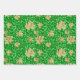 Wrapping paper in a William Morris Art Nouveau pattern of honeysuckle flowers against a background of vines and leaves - flowers in shades of ice pink, coral orange with coral red, and peach / apricot with cream, with emerald green leaves, against a pastel green background