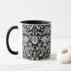 Coffee mug in a vintage William Morris pattern of hyacinths, tulips and leaves, in shades silver gray / grey and white, on a black background