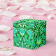 Favor box in a vintage William Morris pattern of hyacinths, tulips and leaves, in shades of emerald and jade green, accented with aqua and white, on a deep forest green background