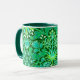 Coffee mug in a vintage William Morris pattern of hyacinths, tulips and leaves, in shades of emerald and jade green, accented with aqua and white, on a deep forest green background