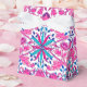 Tent favor box in a vintage William Morris pattern of hyacinths, tulips and leaves, in shades of fuchsia and soft pink, accented with dark blue and turquoise, on a white background