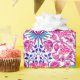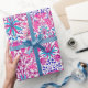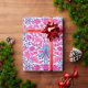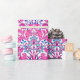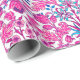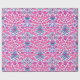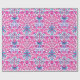 Wrapping paper in a vintage William Morris pattern of hyacinths, tulips and leaves, in shades of fuchsia and soft pink, accented with dark blue and turquoise, on a white background