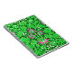 Notebook in a vintage William Morris pattern of hyacinths, tulips and leaves, in shades of lime green, accented with fuchsia pink and white, on a deep emerald green background