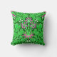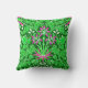 Throw pillow in a vintage William Morris pattern of hyacinths, tulips and leaves, in shades of lime green, accented with fuchsia pink and white, on a deep emerald green background