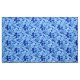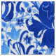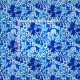 Fabric in a vintage William Morris floral print of stylized lilies and Irises, digitally enhanced and colored, in shades of deep cobalt blue, cerulean blue, and light sky blue on a white background